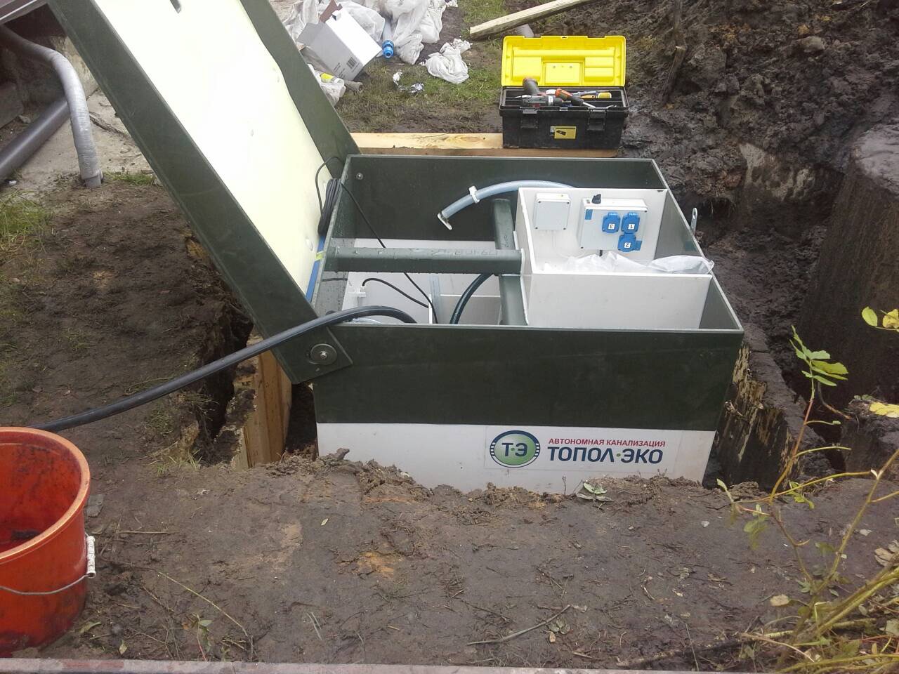 Опускание станции производится вручную либо с помощью стрелы манипулятора или крана. При обсыпке корпуса песком септик одновременно заполняется чистой водой (происходит выравнивание внешнего и внутреннего давления). Далее происходит подсоединение подводящих и отводящих коммуникаций. В последнюю очередь подключается электрический кабель, устанавливаются компрессоры и насос (если станция с принудительным выбросом).