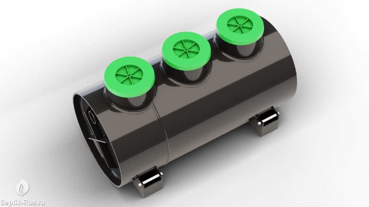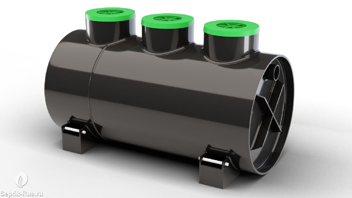 Септик выполнен в виде пластиковой емкости цилиндрической формы, разделенной на технологические отсеки.