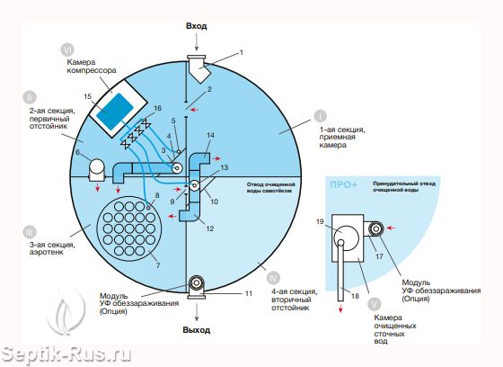 Схема монтажа Евролос ПРО 8 с принудительным отводом очищенной воды в дренажную канаву, контруклон с трубой 110 мм.